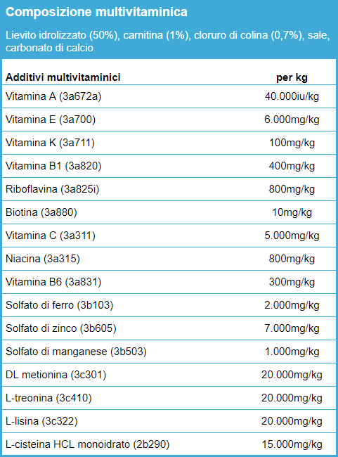 | Vitamina E (acetato in polvere) 50% Vit E | 31,1 |