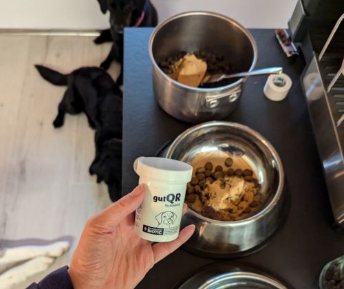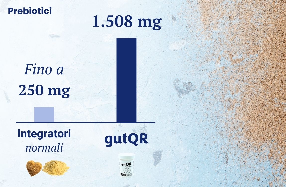 gutQR è un complesso di prebiotici/probiotici/postbiotici con ingredienti clinicamente provati (24+ studi clinici) per l'intestino sano, il sistema immunitario e la pelle del tuo cane.
