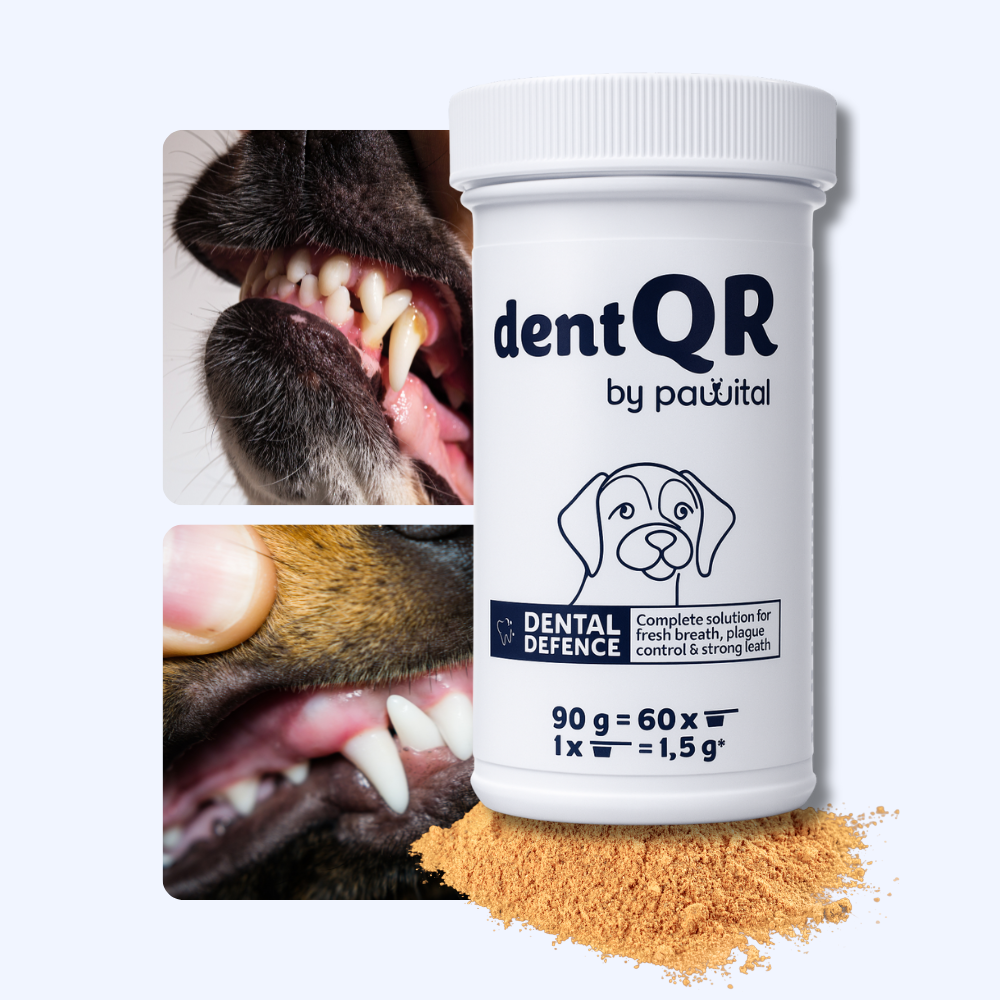 dentQR è una polvere di supporto dentale quotidiano che aiuta a ridurre la placca e la formazione di tartaro del tuo cane, rinfresca l'alito, e supporta la salute gengivale e un microbioma orale equilibrato. Semplicemente da mescolare al cibo del tuo cane.