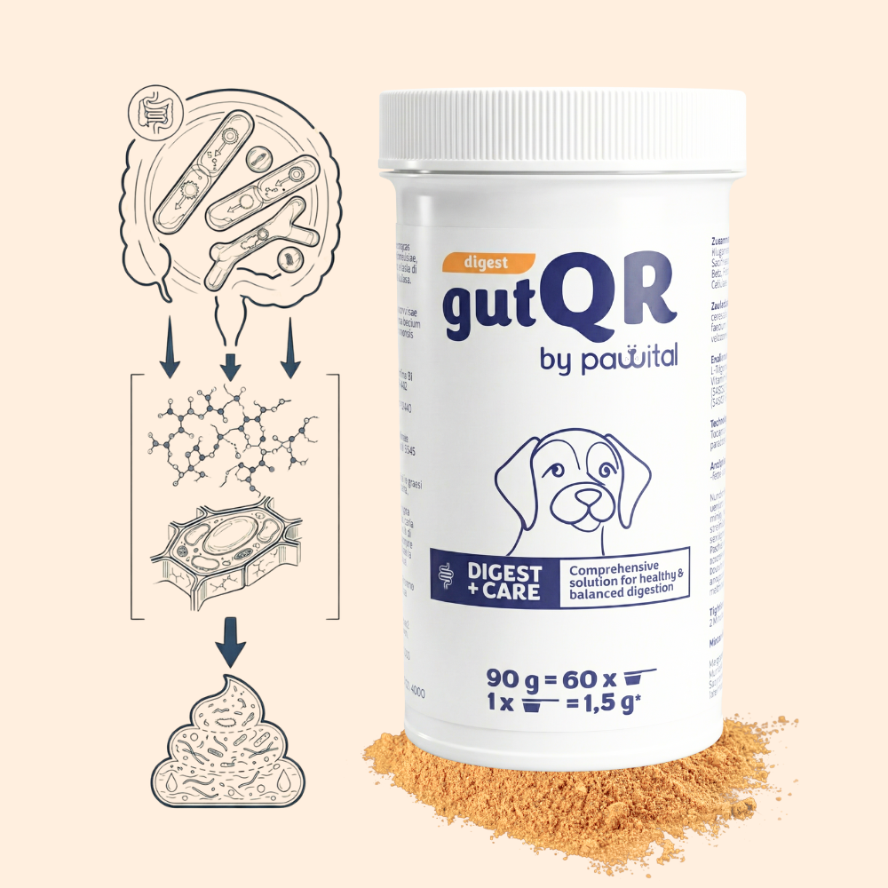 gutQR Digest è una polvere digestiva quotidiana che trasforma le feci molli e disordinate in feci solide e sane – velocemente – mentre supporta l'equilibrio intestinale, il comfort e il ritmo digestivo naturale del tuo cane. Sistema completo di supporto digestivo, dalla rapida solidificazione delle feci all'equilibrio a lungo termine del microbioma intestinale. Basta mescolare nel cibo del tuo cane.